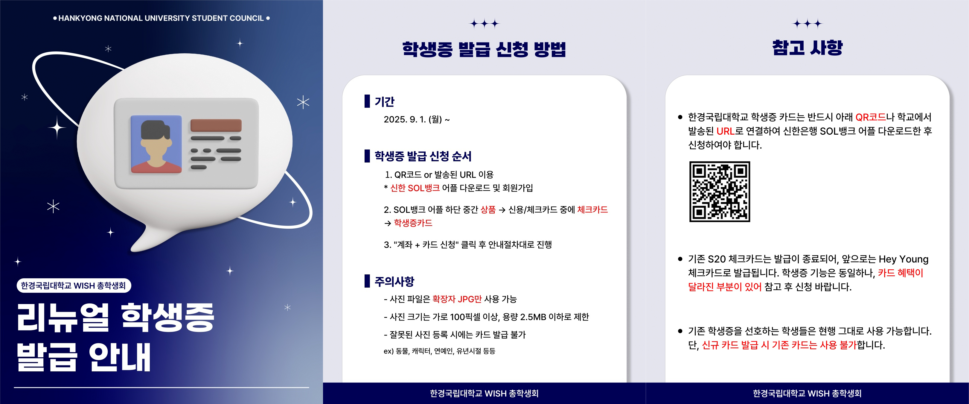 2025년 9월 1일부로 리뉴얼된 디자인으로 학생증이 변경되어 금일부터 새로운 학생증 발급 신청이 가능합니다.