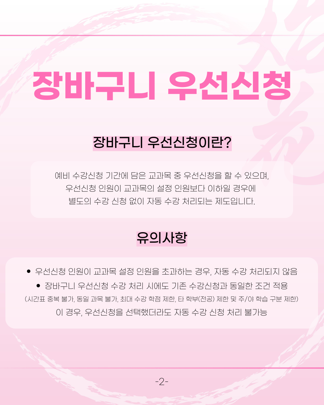 이번 학기 수강신청부터는 ‘장바구니 우선신청 제도’ 가 새롭게 도입되어 보다 체계적인 수강신청이 진행될 예정입니다.