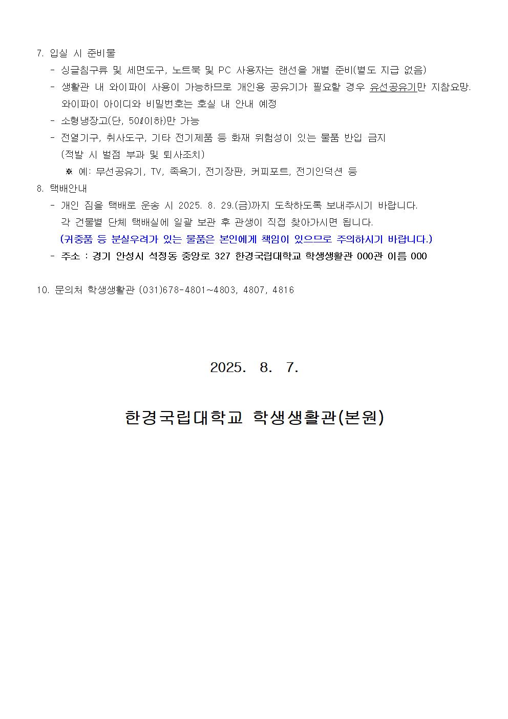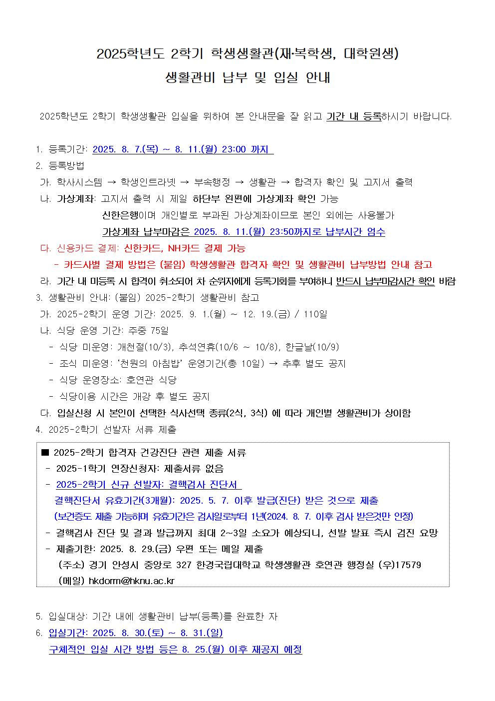 (안성)2025학년도 2학기 학생생활관(재ㆍ복학생, 대학원생) 생활관비 납부 및 입실 안내