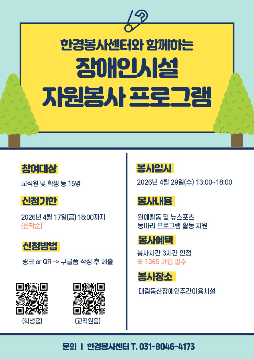 4월29일(수) 대림동산 장애인 복지시설 봉사활동 안내