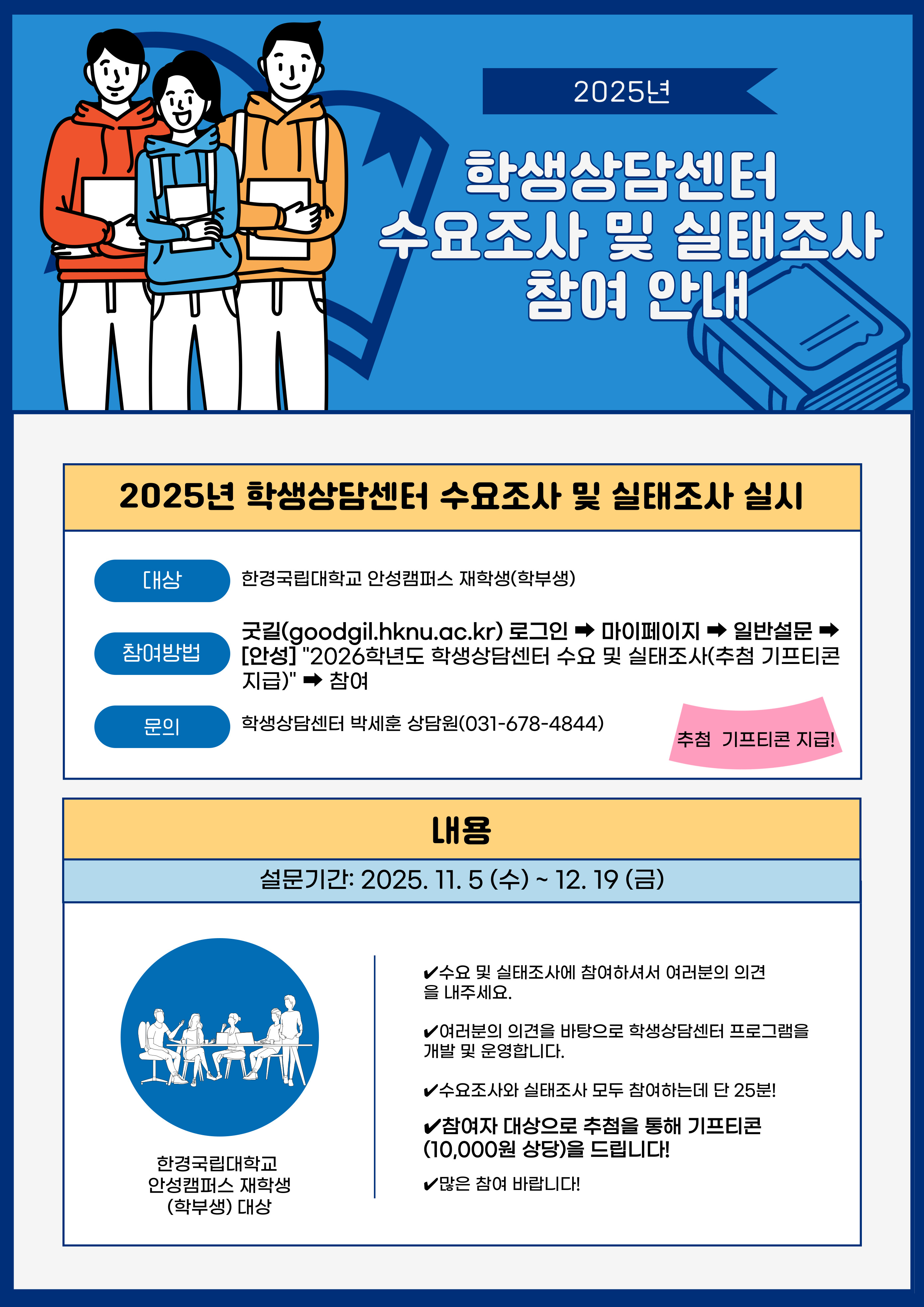- 굿길(goodgil.hknu.ac.kr) 로그인 → 마이페이지 → 일반설문 → [안성] "2026학년도 학생상담센터 수요 및 실태조사(추첨 기프티콘 지급)" → 참여