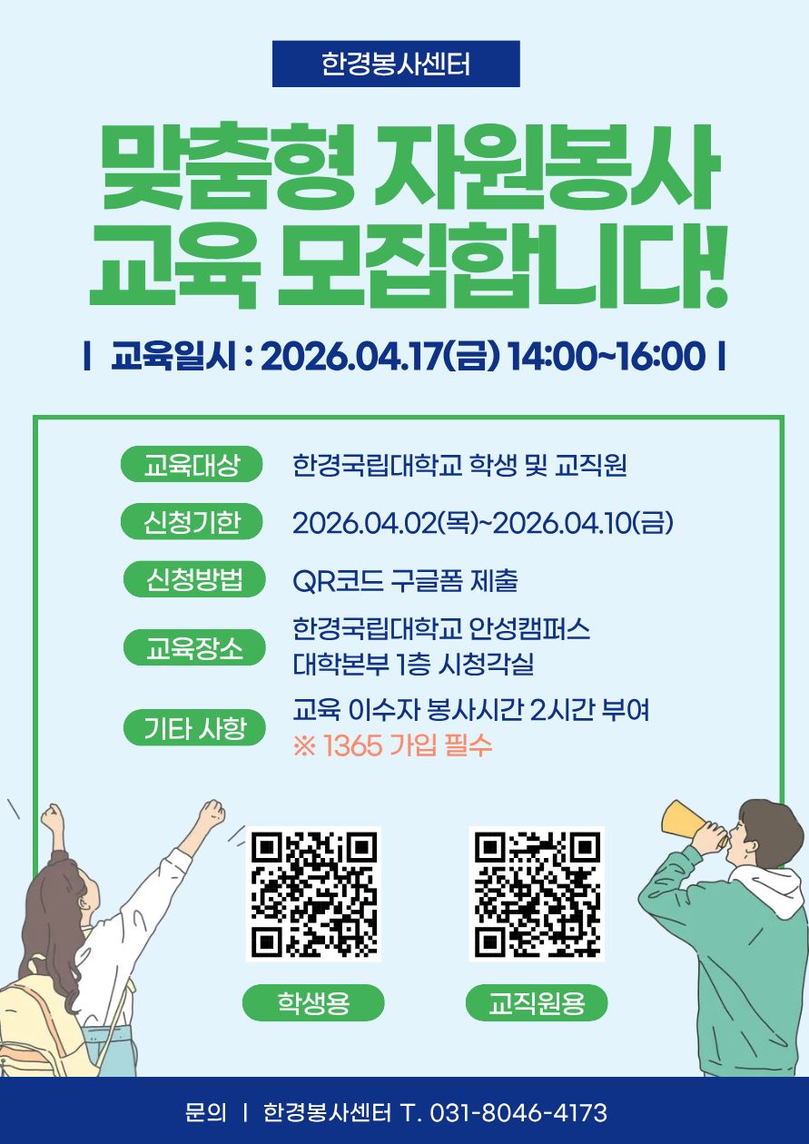fnctId=bbs,fnctNo=69 페이지 공유 글번호 94539 2026학년도 자원봉사 교육 안내(4.17.금) 작성일 2026.04.03 수정일 2026.04.09 작성자 한경봉사센터 조회수 291 많은 참여 부탁드립니다. 첨부파일 첨부파일이(가) 없습니다.
